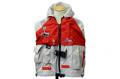 The webbing chest harness includes a lifting becket with stainless steel D Ring and buckle system. Safety features include crotch strap with detachable clip, retro-reflective tape over the shoulders, integral concealed hi-visibility waterproof hood and SOLAS approved automatic light. The flare pocket, knife or Maglite holder is under a velcro flap. The two colour contrasting webbing loops are for VHF radio and compass. A radio microphone loop is located at the top of the oral inflation tube cover.